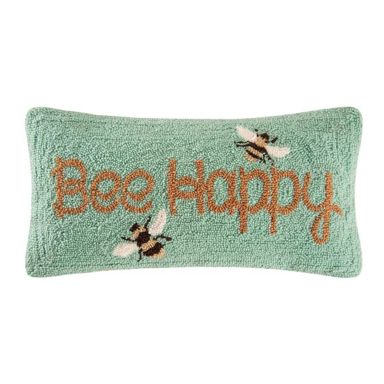 Bring a cheerful touch to any room with this hand hooked pillow in a muted summertime color palette of Sea Glass, Rust, and white, displaying two cheerful bees with the message, “Bee Happy.”Crafted with acrylic yarn on cotton canvas, secured with a zipper closure and a removable polyester insert for easy care.