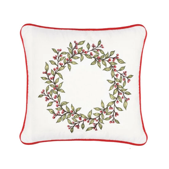 Simplicity makes a statement with the Berry Garland accent pillow. Carefully embroidered leaves and berries form a centric wreath atop a simple white ground, this pillow is an elegant accent to your winter decor. Finished with a festive crimson piped edge, this pillow is crafted with a cotton cover, has a removable polyester insert and is secured with a zipper closure. Size: 16 x 16 inches. Spot cleaning recommended. Care instructions: Spot Clean. Material: Cover: 100% Cotton. Product dimensions: 16″ x 16″. Items included: 1.