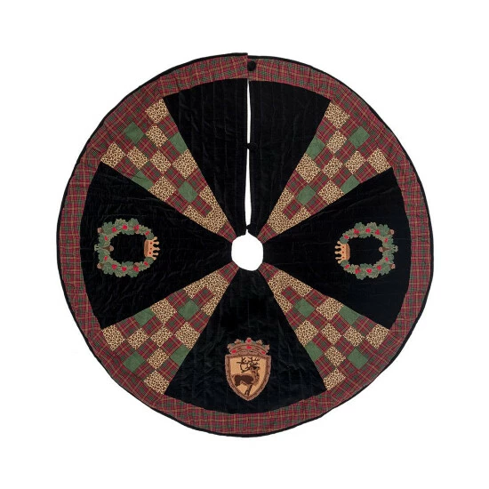 Feel like a royal this holiday season by adding a castle inspired tree skirt to your Christmas decor. Checkered wedges with different patterns are accented by tufted wreaths, crests and crowns. They pop amongst the black velvet ground and add texture to the skirt. It is finished with a plaid border and a black trim and secured with button closures. Care instructions: Spot Clean. Material: Cotton. Product dimensions: 54″. Items included: 1.