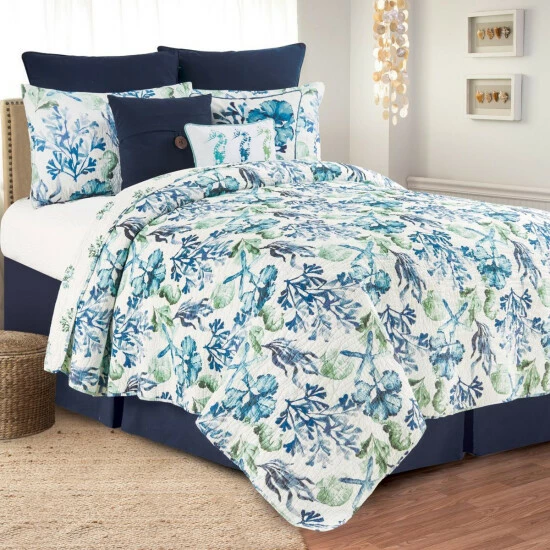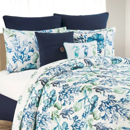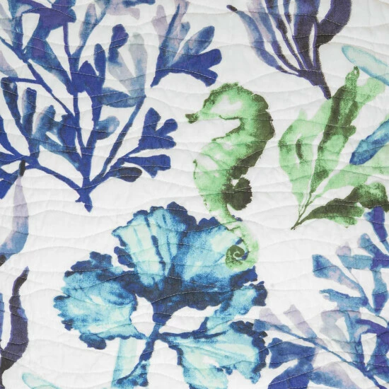 Let the soothing colors of the sea transform your bedroom with Bluewater Bay quilt collection. This collection features starfish, seahorse, coral, and seashell motifs in hues of indigo, aqua and green in a watercolor-inspired design that makes it easy to imagine your are diving into an underwater wonderland. Bluewater Bay reverses to an aqua and green coral pattern on a white ground for a more subtle styling option that is perfect for your everyday or coastal look. Pair with our rich blue euro shams and bed skirt for the finishing touches. Crafted of cotton and machine washable for easy care. Accent pillows, euro shams and bed skirt sold separately. Love this pattern? Bluewater Bay is also available in our tabletop collection. Care instructions: Machine Wash. Material: Cotton/Cotton/Blend. Product dimensions: 64″ x 86″; 20″ x 26″. Items included: 2.