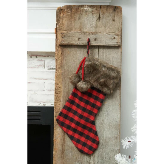 Get cozy this holiday season with this buffalo check stocking. This red and black checkered stocking is cuffed with soft faux fur, bringing rustic elements together to create a lodge inspired feel for the holiday season.