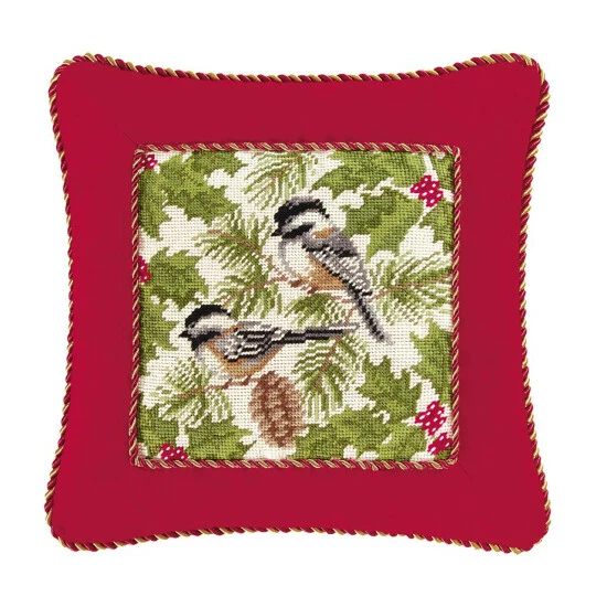 A lovely winter accent, this beautifully handcrafted needlepoint pillow features two chickadees in a charming winter scene. Hand sewn with 100% wool thread on a canvas ground and backed with ultra soft 100% cotton velvet, this pillow is filled with a 100% polyester insert, secured by a zipper closure.. Care instructions: Spot Clean. Material: Wool/Cotton/Polyester. Product dimensions: 12″ x 16″. Items included: 1.