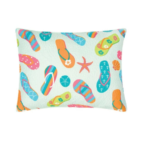 Fall asleep in a coastal paradise, night after night with the Flip Flop Life Quilt Set. With a unique, colorful design comprised of flip flops, starfish and seashells on a light blue ground, along with a whimsical quilted design, this quilt looks great in a beach cottage. Reverse to a colorful coordinating striped pattern for additional styling options. Crafted of cotton and machine washable for easy care. Coordinating euro shams, accent pillows and bed skirt sold separately. Love this pattern? Flip Flop Life is also available in coordinating tabletop collection and a ruffled valance. Care instructions: Machine Wash. Material: Cotton/Cotton/Blend. Product dimensions: 108″ x 92″; 20″ x 36″. Items included: 3.