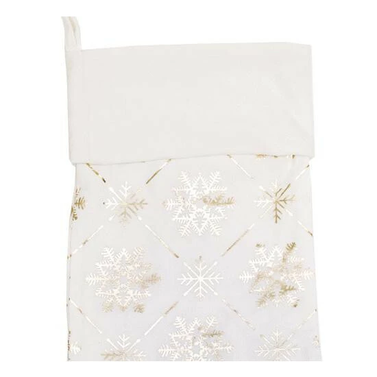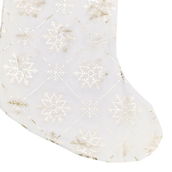 Decorate for the holiday season with this stocking covered in gold foil snowflakes. It is sure to bring joy to your home year after year.