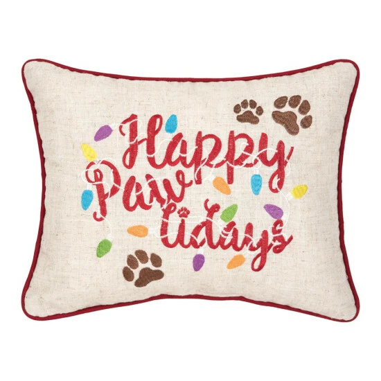 Make the holidays happy with this Pawlidays accent pillow. Embroidered with the message Happy Pawlidays in a festive red with Christmas lights and paw prints, this pillow sure to draw any pet lovers attention to your decor this holiday season. It may even become your furry friend’s favorite pillow. Crafted with a soft polyester/linen blend cover and finished with a red piped edge, this pillow is filled with plush polyester filling and sewn closed. Size: 12 x 15 inches. Spot cleaning recommended. Care instructions: Spot Clean. Material: Cover:80% Polyester/ 20% Linen. Product dimensions: 12″ x 15″. Items included: 1.