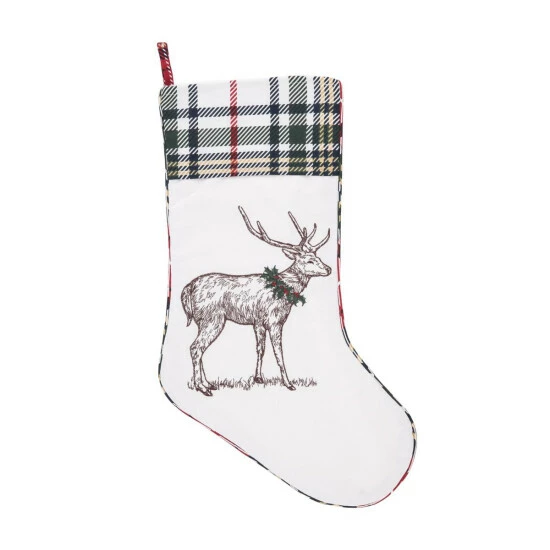 Have yourself a very merry Christmas with this rustic holiday stocking. Featuring a meticulously embroidered deer adorned with a tufted crown of festive greenery on a crisp snow white background, this detailed accent will add a stunning touch to your winter dΓ©cor. Finished with a festive plaid cuff and ready to hang fabric loop. Crafted of 100-percent cotton. Love this pattern? Lennox Plaid is also available in our bedding, tabletop, and holiday collections. Add your own special touch by personalizing the cuff with the name of your family or friends. Contact your local monogram shop for additional information on personalization.. Care instructions: Machine Wash. Material: Cotton. Product dimensions: 8.5″ x 20″. Items included: 1.