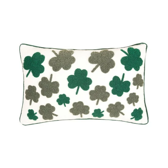 Get lucky, not pinched, with a splash of green. This plush, rectangular pillow features a tufted Irish clover design in deep greens and different sizes. The floating shamrocks stand out against the white ground with a green piped border. Crafted with a cotton cover and secured with a zipper closure this pillow features a removable polyester insert for easy care. Mix with our Luck of the Irish and Shamrock Ribbon art pillows to complete your festive Irish decor. Care instructions: Spot Clean. Material: Cotton. Product dimensions: 14″ x 22″. Items included: 1.