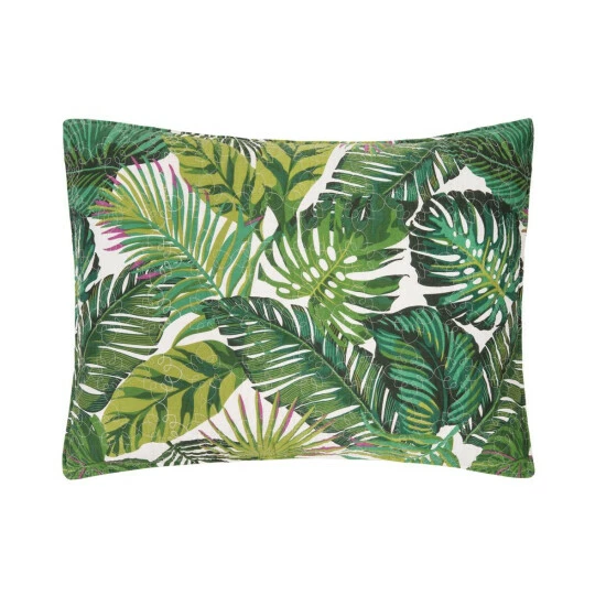 Fall asleep in a coastal paradise, night after night with the Layla Quilt Set. With a lush palm leaf pattern comprised of various shades of green with hints of purple and a unique floral medallion quilting pattern, this quilt looks great in a beach cottage or your tropical bedroom retreat. Reverse to a stylish green on a crisp white bamboo lattice pattern for additional styling options. Crafted of cotton and machine washable for easy care. Accessories sold separately. Love this look? The Layla pattern is also available in tabletop, throw, valance and shower curtain. Care instructions: Machine Wash. Material: Cotton.
