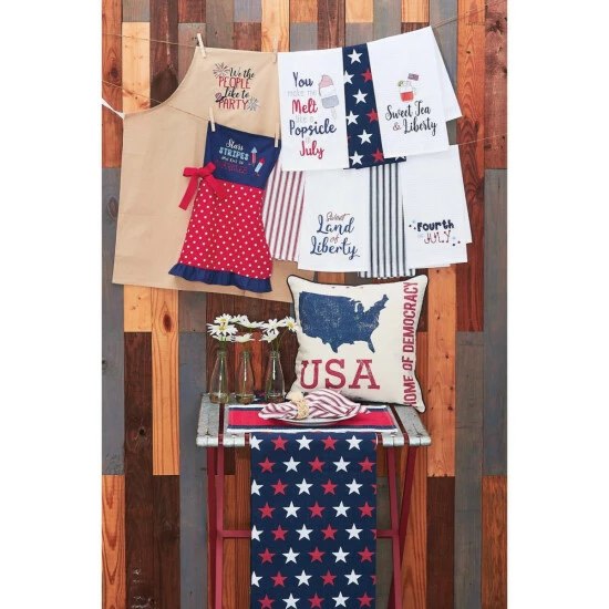A summer time staple for your picnic or BBQ, the Liberty Stripe tabletop collection features a broad red stripe with white and blue finishing off the home-style charm. Crafted of 100-percent cotton, the Liberty Stripe tabletop collection is machine washable for easy care.