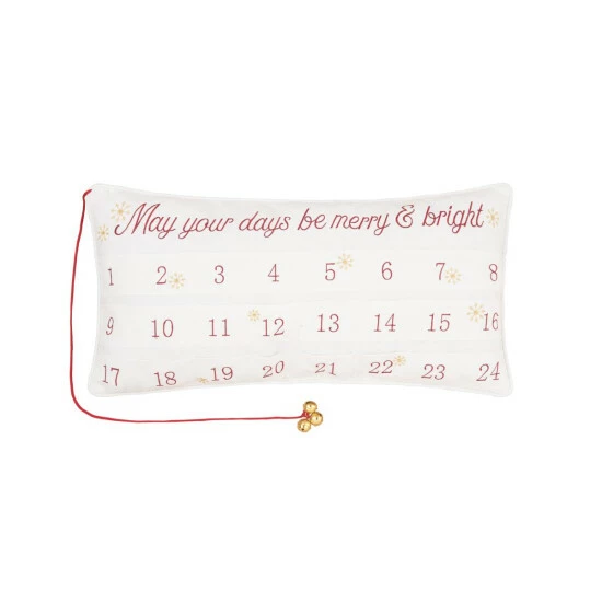 Add a unique Christmas accent to your home with the Merry & Bright Advent Pillow. Featuring a classic Advent calendar embroidered daily countdown pockets with an attached marker of jingle bells, this festive piece will have you counting down the days until Christmas in comfort and style. Crafted with a soft cotton cover, finished with a coordinating piped edge and lofty polyester filling. Spot cleaning recommended. Size: 12-inches x 24-inches Care instructions: Spot Clean. Material: Cotton. Product dimensions: 12″ x 24″. Items included: 1.