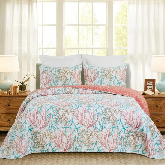 Fall asleep in your personal coastal paradise night after night with Oceanaire Seafoam. With a captivating branching coral design in a sea glass and coral colorway, this quilted twin bedspread will complete your relaxing beach house look. Oceanaire Seafoam reverses to a lattice pattern in vibrant coral to create additional styling options for your summer vacation home, your beach cottage, or your everyday coastal style.
