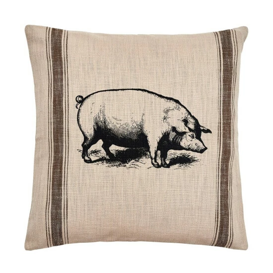 Add a touch of rustic country charm to your home, or incorporate a quaint feature with your farmhouse theme with the Pig Feed Sack Pillow. This accent features a simple pig motif framed by forest-green stripes on a natural tan background. Crafted with a 100-percent cotton cover, secured with a zipper closure and removable polyester insert for easy care. Spot cleaning recommended. Care instructions: Spot Clean. Material: Cotton. Product dimensions: 20 x 20. Items included: 1.
