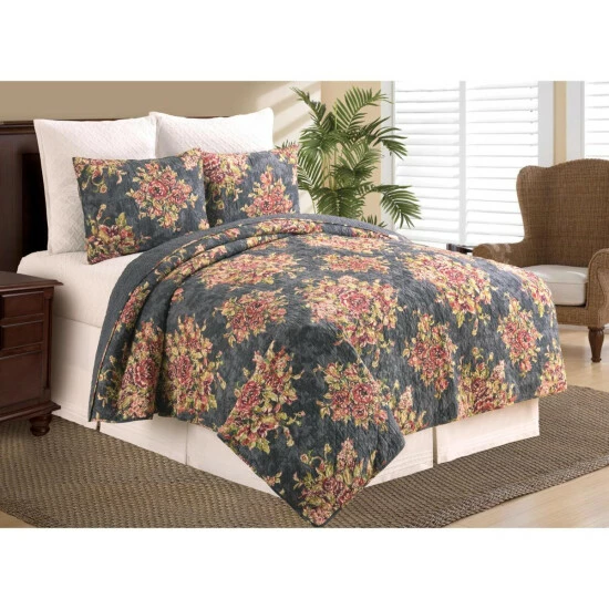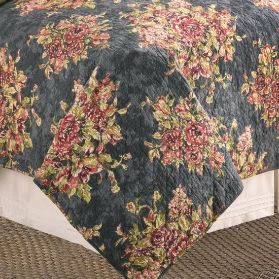 Transform your favorite room with the dramatic pattern of the Regina Quilt Set. The dynamic interplay with oversized lifelike floral blooms and a stormy gray background creates captivating depth and contrast as a focal point of your bedroom dΓ©cor. Reversible to a tonal speckled diamond for additional styling options. Pair with our Basketweave White euro shams and our White Tailored bed skirt for the finishing touches. Crafted of cotton and machine washable for easy care. Accent pillows, euro shams and bed skirt sold separately. Love this pattern? Regina is also available in a tabletop collection, quilted throw and a ruffled valance. Care instructions: Machine Wash. Material: Cotton/Cotton/Blend. Product dimensions: 90″ x 92″; 20″ x 26″. Items included: 3.