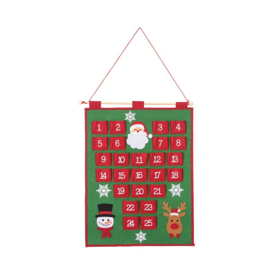 25 small pockets and a snowman, reindeer, and Santa Claus garnish the front of this Advent Calendar. Care instructions: Wipe Clean. Material: 100% Polyester. Product dimensions: 16″ x 22″. Items included: 1.