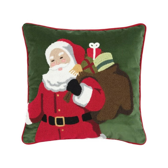 Santa is ready to make his deliveries this holiday season, he’s making a list and checking it twice. Displaying an intricate chain stitched motif featuring the man in the red suit on a rich hunter green ground, this accent pillow will quickly become a beloved tradition. Crafted with a cotton cover and finished with a festive crimson piped edge, this pillow is filled with plush polyester filling and sewn closed. Size: 18 x 18 inches. Spot cleaning recommended. Care instructions: Spot Clean. Material: Cotton. Product dimensions: 18″ x 18″. Items included: 1.