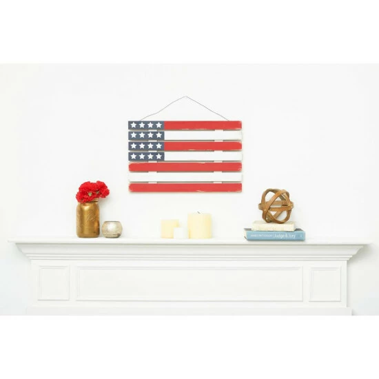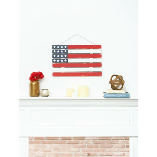 Whether you are celebrating the Fourth of July or giving your home an everyday Americana look, this wood slat American flag wall décor sign will fit right in. The bold red, white and blue of the land you love in a fun wooden slat design makes patriotic style a breeze in any room of your home.